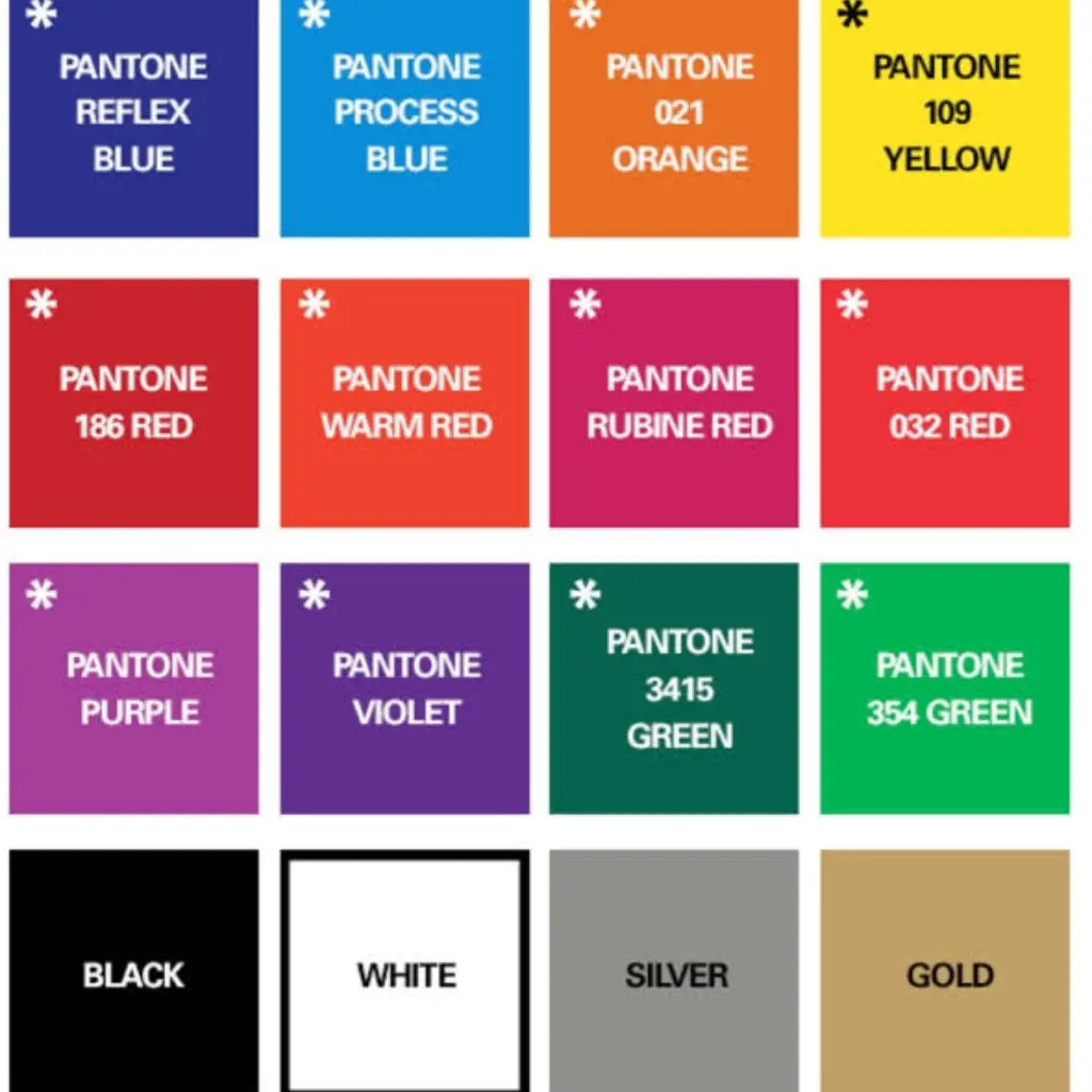 Les couleurs d’impression standard sont : noir – blanc – rouge – bleu « process » – bleu « reflex » – vert – jaune – orange – mauve – magenta.
